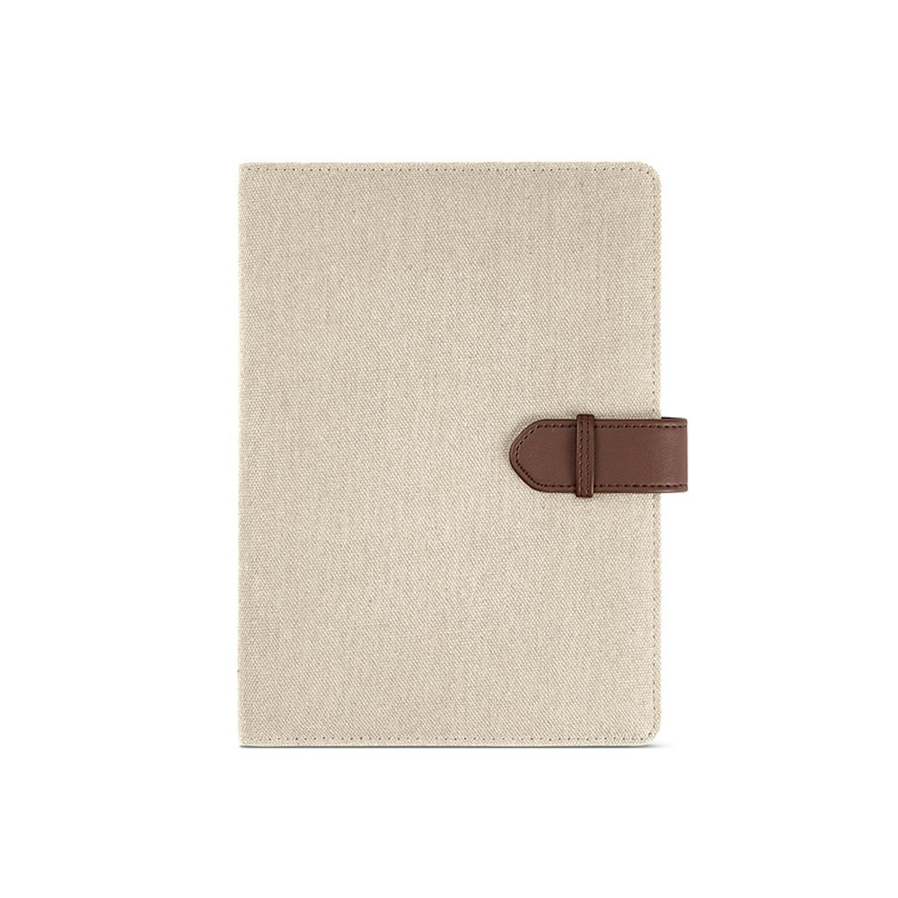 The Elliot recycled cotton canvas A5 folder boasts a convenient recycled PU snap closure, a pad of 64 FSC dotted pages (70 gsm) with a built-in spot for organizing your date and page number, a phone pocket, a double pen holder and 2 card slots. Crafted for sustainability, it's your stylish companion for success. Packed inside an individual kraft box.