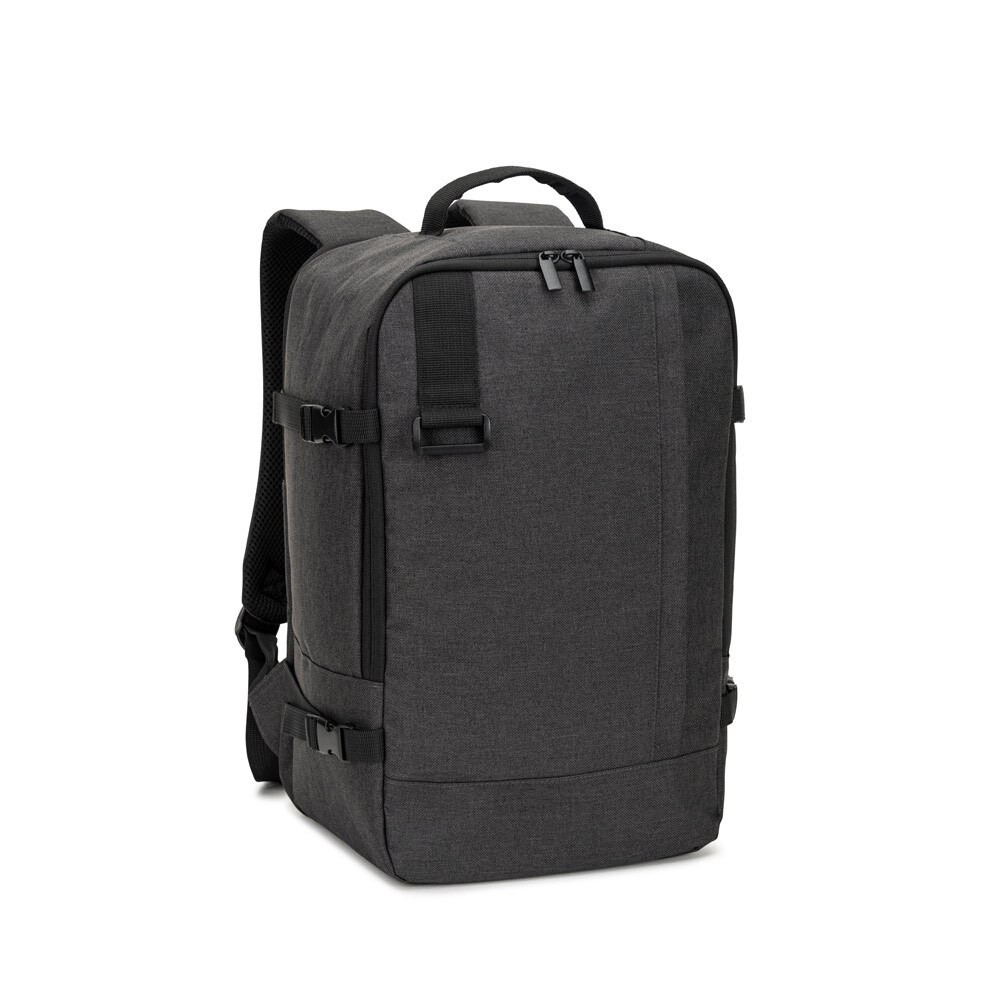 A backpack designed to meet the dimensions required by airlines, it allows you to travel with everything you need as hand luggage. Made from high-density 600D recycled polyester with a water-repellent coating and 210D recycled polyester lining. It has a large main compartment for clothes, a fully padded compartment for a laptop up to 14" and a front pocket. The backpack offers you greater comfort when travelling due to its padded top handle, its compression straps on the sides that allow you to adjust the size of the backpack to your volume and the mesh back with trolley strap. The front has a part for hanging an object, such as a bottle with a carabiner. Capacity up to 20 L. 250 x 400 x 200 mm