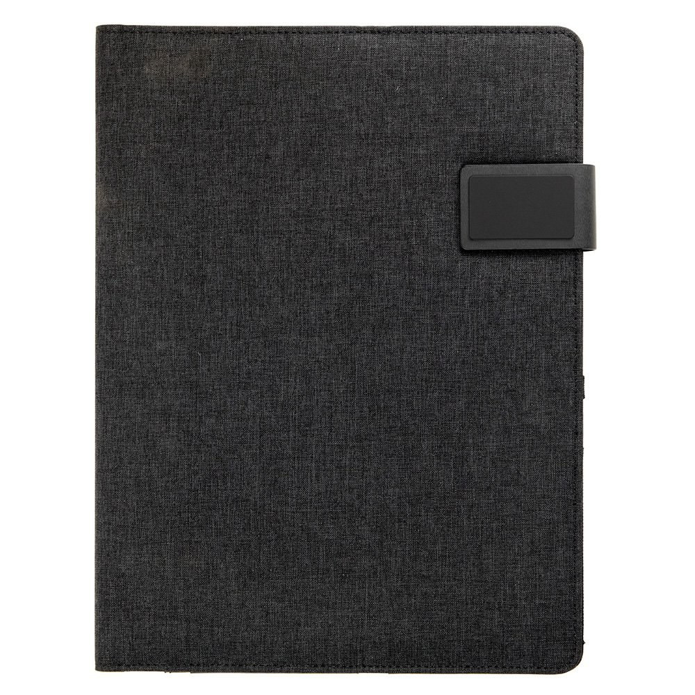 Portfolio A4 size made of polyester with magnetic closure. It has several inner pockets for different uses, pen loop, and notebook with 20 sheets. Closure strap wit PU detail.