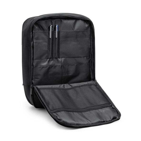 Backpack computer bag with main zippered compartment. Padded interior computer pocket. Side handle. Padded back panel. Adjustable padded shoulder straps. Trolley strap.