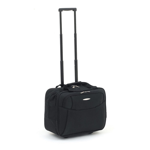 Two-wheeled trolley made of polyester 600D with a multitude of compartments, one suitable for laptops (max size 17"). Size for cabin luggage. Reinforced external handles and telescopic handle.