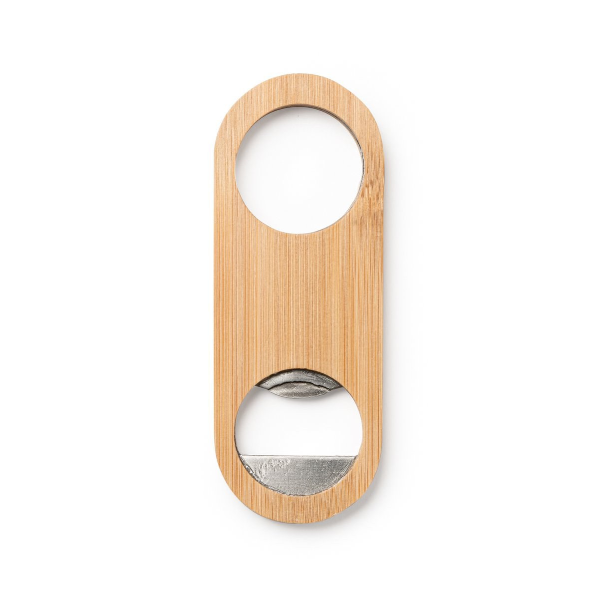 Compact design bottle opener with stainless steel interior and shaped top for hanging.