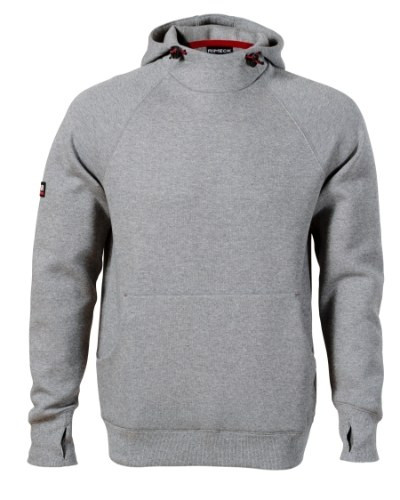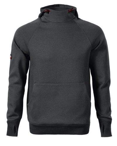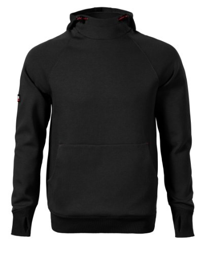 straight cut with side seams, hood with lining, adjustable by elastic drawstring, inner back neckline with a contrast tape, raglan sleeves with double stitching, kangaroo patch pocket, 2 hidden zipper pockets, 2:2 rib knit bottom hem, cuffs and neckline with 5 % elastane, cuffs with hole for thumb, contrast elements