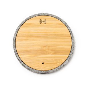 Wireless charger with main structure in bamboo and RPET fabric, compatible with wireless technology devices.