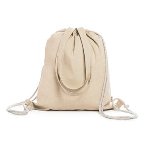 Drawstring backpack bag made of 100% recycled cotton in mottled finish, with 70 cm long matching handles and strings in natural colour.