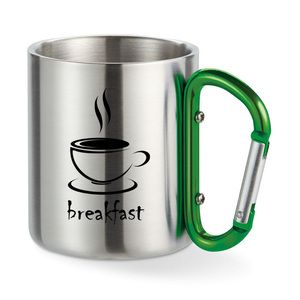 Double wall stainless steel mug with carabiner handle.