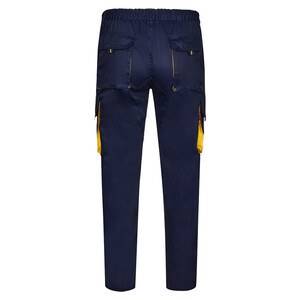 Two-tone multi-pocket twill trousers (200g/m²), in cotton (35%) and polyester (65%). With elasticated waistband and contrasting colour on the gussets, pullers and stitching. Contains six pockets: (2 French pockets, 2 side gusset pockets and 2 back gusset pockets)