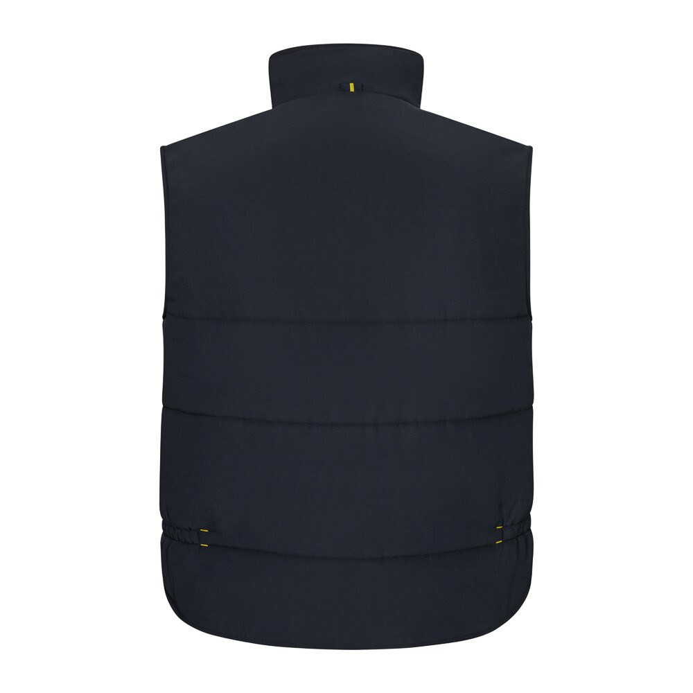 Two-tone, multi-pocket quilted vest (120g/m²), in polyester (100%). Zip fastening, concealed with button placket. Elasticated side waistband, windbreaker at armhole. With bellows, pullers and stitching in contrasting colour. Contains seven pockets (2 bellows pockets on the chest, 2 lower bellows pockets, 2 side pockets, 1 bellows pocket on the chest and 1 inside pocket)
